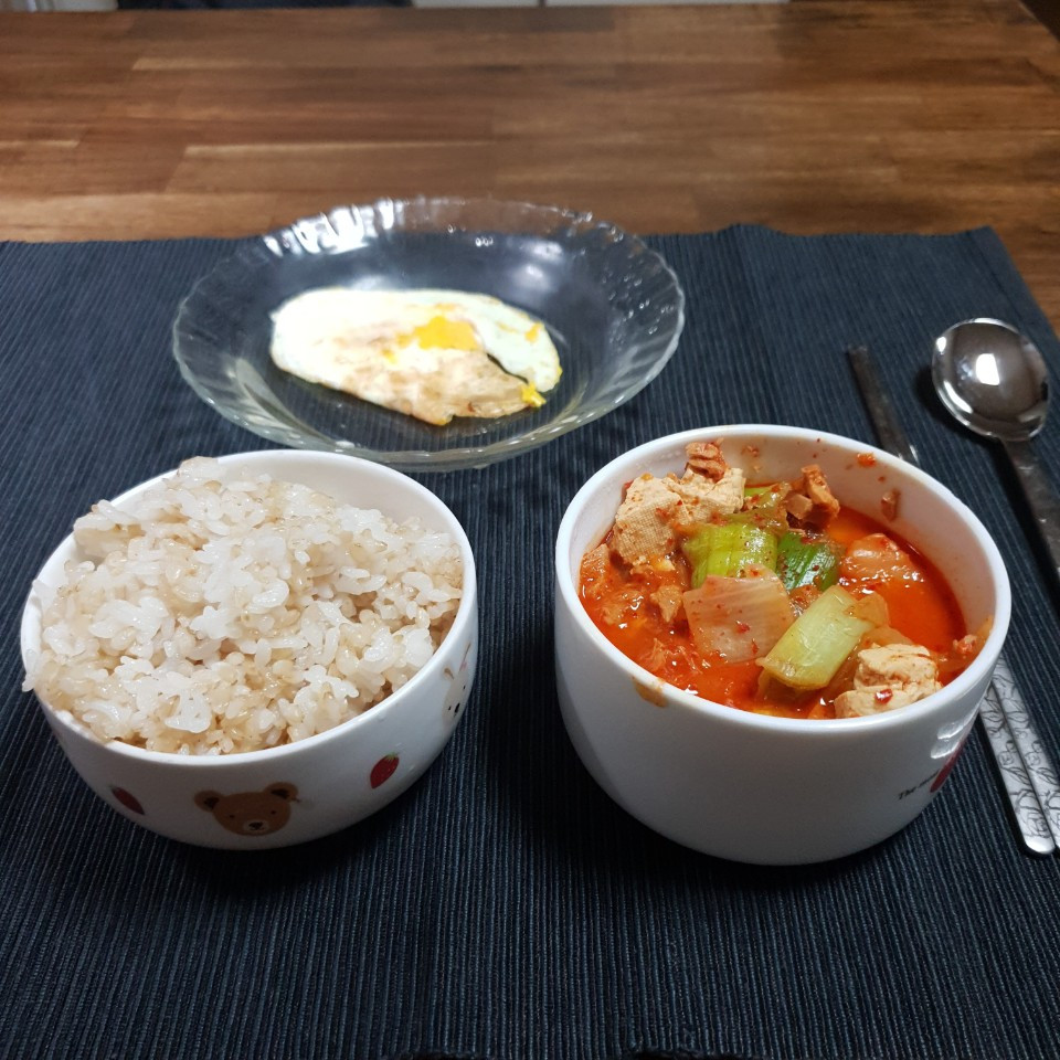 언젠가 매콤한 순두부찌개가 정말 당겼던 퇴근길이 있었는데, 집에 있는 재료로 비슷하게 맛만 낸 적이 있다. 비비고의 사골국물을 베이스로 얼려 놓은 두부와 파, 김치와 김치 국물, 참치를 넣고 끓여낸 이름 모를 찌개다. 왠지 모르게 국물이 너무 하얘서 고춧가루와 고추장도 눈대중으로 추가해가며 빨간 국물의 비주얼을 완성시켰다. 음.. 이제 와서 생각해보니 김치찌개라고 볼 수 있겠다. 그릇에 덜어내고 계란 프라이와 햇반과 함께 플레이팅을 해보니 그럭저럭 먹을 만한 한 상이 되었다.