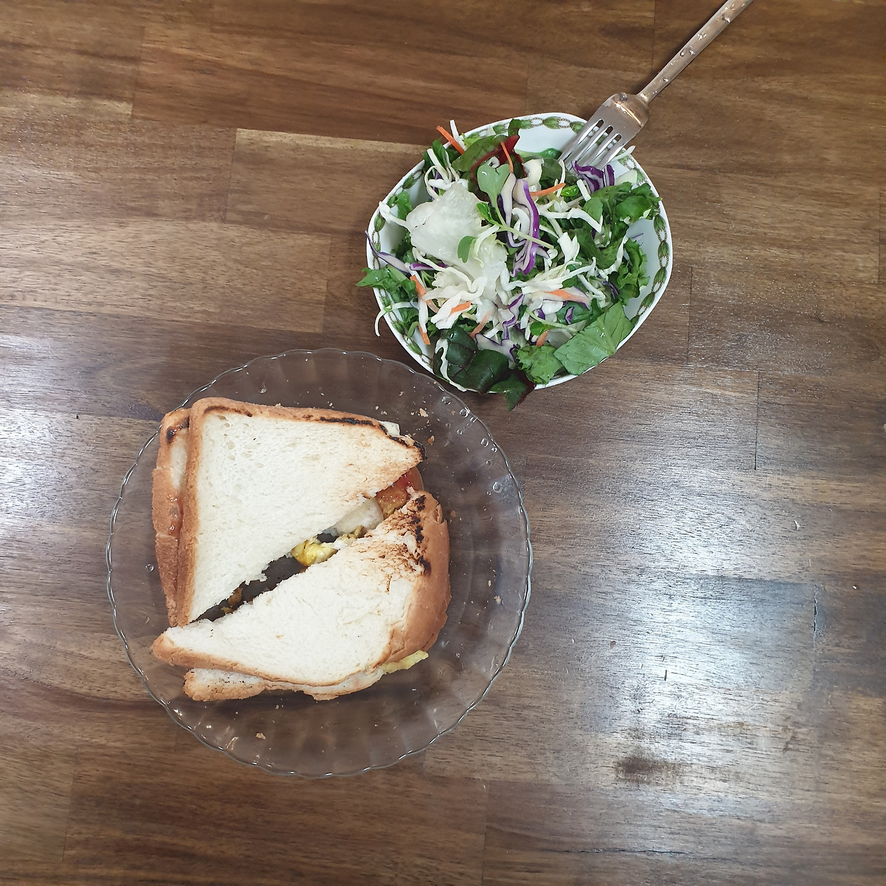 어느 주말 tvN 예능 '스페인 하숙'에서 차승원 씨가 외국인 투숙객들을 위해 샌드위치 도시락을 만드는 것을 보고, 침이 고였다. 늦은 새벽시간이라 아침이 되면 꼭 해 먹으리라 각오하며 잠자리에 들었다. 그리고 창 밖으로 아침 햇살이 비치자마자, 나는 냉장고 앞으로 직행했다. 어제 본 레시피는 간단했다. 식빵을 굽고 빵 한쪽에는 쨈을 바른 뒤 계란 지단과 햄을 얹어내면 끝! 나는 햄이 없어서 파와 마늘을 섞은 계란 지단과 치즈, 쨈을 더해 마무리했다. 쿠팡으로 주문한 채소 믹스를 곁들이니 제법 한 끼 식사로 충분했다.