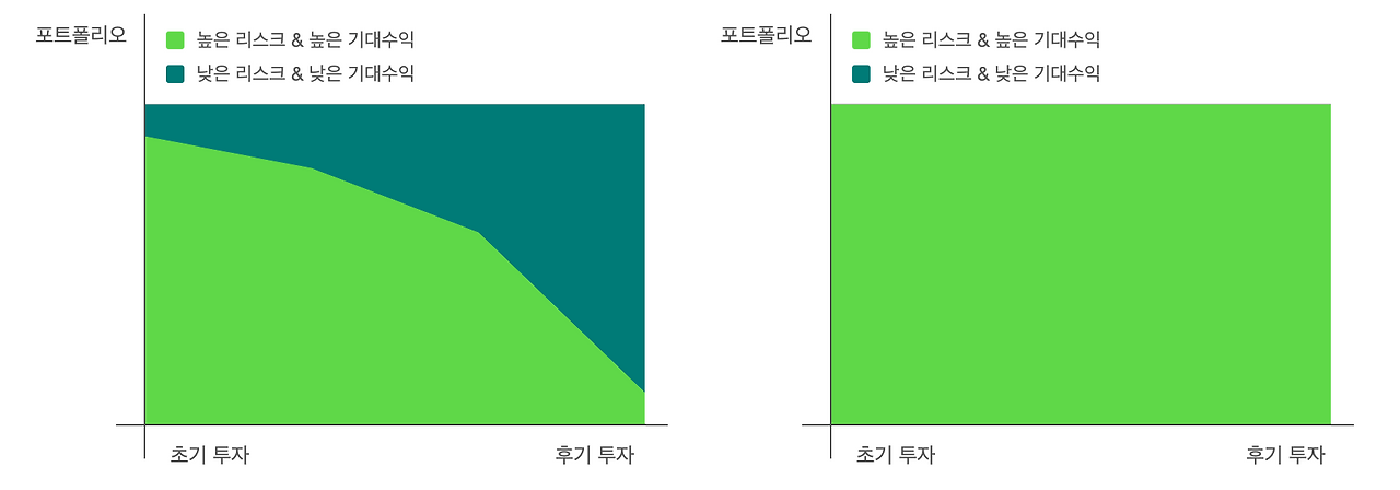 앞선 글(심사역으로서 1년, 내가 발견한 비밀들)에서도 설명했지만 스타트업 투자의 특성상, VC의 성공은 10배 이상 성장하는 아주 소수의 스타트업에 달려있다고 해도 무방합니다. 페이팔 마피아 중 한 명인 피터틸 역시 펀드 전체의 수익을 견인할 만한 스타트업에 투자하라는 이야기를 한 적이 있죠. 그렇지만 후기 투자로 갈수록 큰 수익이 기대되지만 실패할 확률도 높은 스타트업 + 기대 수익은 크지 않지만 실패할 확률도 낮은 스타트업을 한 펀드에 담아서 포트폴리오를 구성하는 경우를 많이 볼 수 있습니다. 과연 이것이 유효한 전략일까요? 요컨대 예상 불가능한 변수가 너무나 많고, 각 스타트업 모두 독립 사건인 하나의 펀드에서 위처럼 포트폴리오를 구성하면 실제로 리스크를 낮출 수 있는 것일까요?