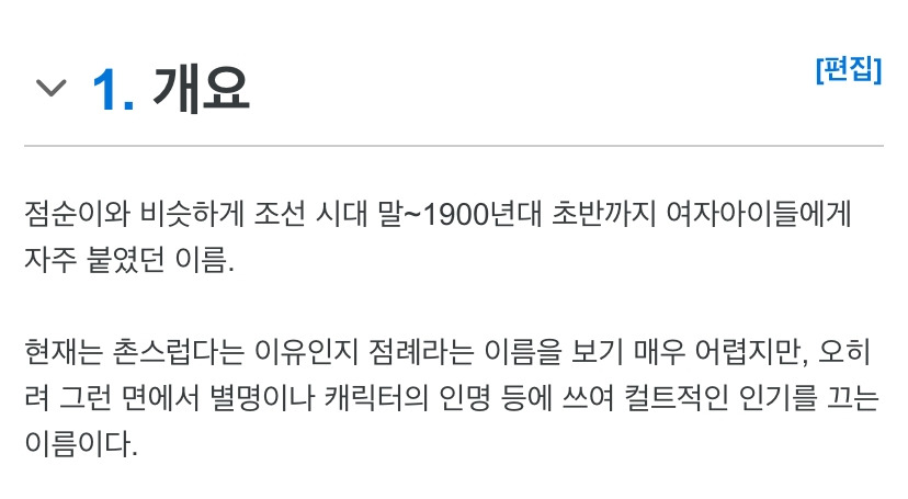 태어났을 때 어깨에 큰 점이 있어서 돌아가신 할아버지께서 그냥 점례라고 짓자 해서 그렇게 됐다고 한다. 나무위키에 보면 1900년대 초반까지 많이 붙였던 이름이라고 하는데 1960년대 생인 우리 어머니에게는 너무 고민 없이 붙이신 이름이 아닐까 섭섭하기도 하다.