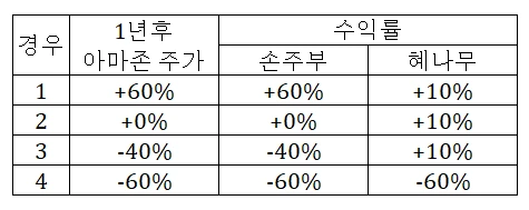 위의 표에서 보면 알 수 있듯이, 손주부의 수익률은 아마존 주가를 그대로 추종하고, 혜나무 작가는 주가가 반토막이 나지 않는 이상 10%의 이익을 항상 보장받는다.
