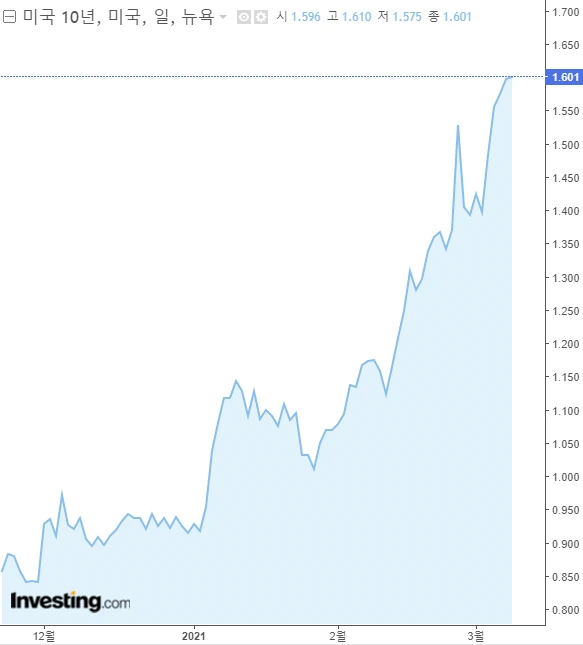 미국 국채 10년짜리의 금리가 연초부터 슬금슬금 오르더니 글을 쓰는 3/9일 오전 1.601%를 찍었다. 이는 미국 S&P 500에 속해 있는 기업들의 평균 배당 수익률 1.5%를 넘는다.