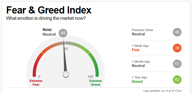 공포 탐욕 지수는 시장에 참여하고 있는 투자자들의 현재 마음 상태를 보여준다. 자동차 계기판처럼 생겼는데, 좌측 빨간색 쪽으로 갈수록(0에 가까울수록) 공포에 질려있는 상태이고 우측 녹색으로 향할수록(100에 가까울수록) 탐욕스러운 투자자로 가득한 상태다. 작년 코로나가 발생했을 때 시장은 공포에 질려있었고 지수는 0에 가까운 2에 불과했다. 6월 4일 기준 공포 탐욕 지수는 46으로 중간(Neutral) 단계에 있다. 해당 지수는 CNN에서 7가지 지표를 기초로 산출된다.