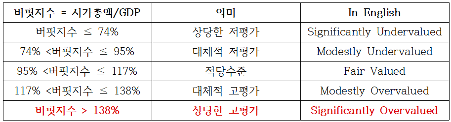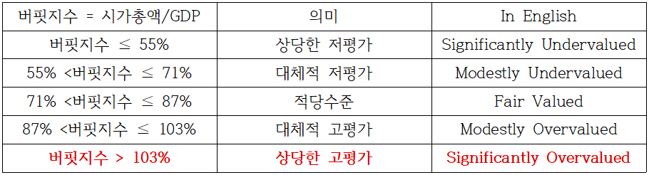 산출된 버핏 지수를 과거 경제상황과 비교해서 다음과 같이 총 5개의 카테고리로 나누었다.