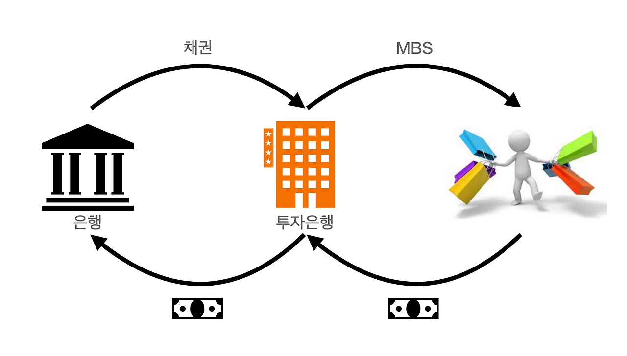 은행은 투자은행에게 돈 받을 권리 (채권)를 건네주고 돈을 받는다.