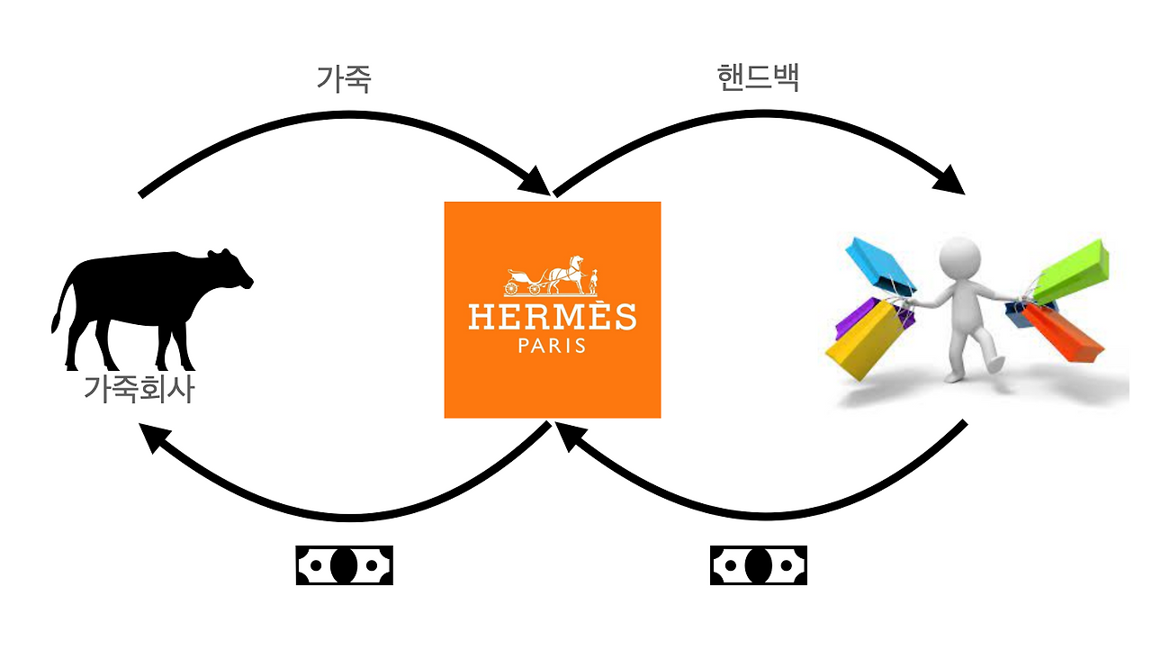 에르메스는 납품받은 가죽으로 버킨백을 만들어 소비자에게 판매하고 돈을 받는다.