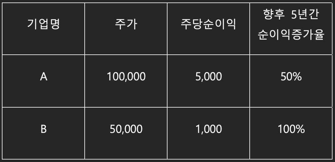 기업 A, B 중에서 더 저평가된 기업은? (PEG 관점에서)