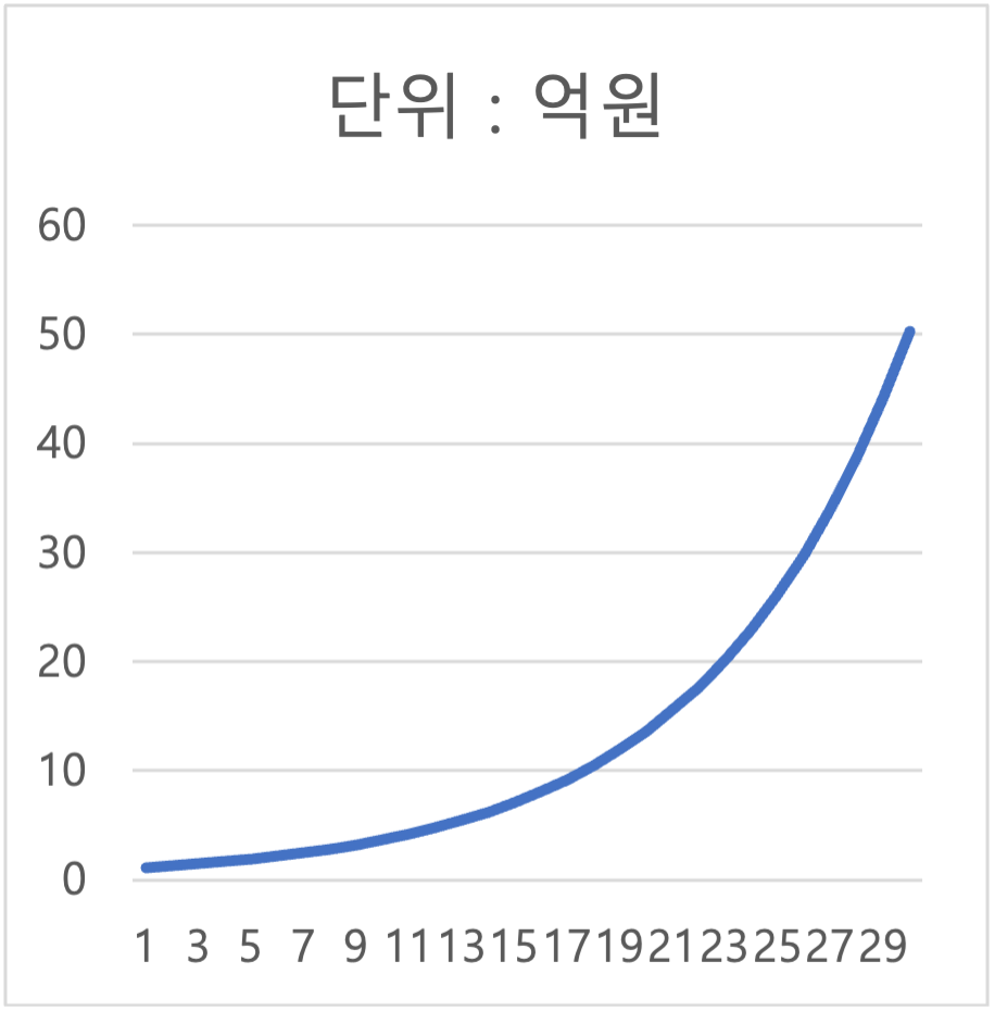 위의 그래프는 1억이라는 돈이 50억이 되어가는 과정을 보여줍니다. 그래프에서 알 수 있듯이 자산이 증가하는 속도는 일직선 일차 함수가 아니라 지수 함수입니다. 지수 함수의 특성상 처음 몇 년 동안은 자산이 거의 불어나지 않습니다. 1억 원이 10억 원이 되는데 18년이란 시간이 걸리지만, 10억 원이 20억 원이 되는 데에는 5년밖에 걸리지 않았습니다.