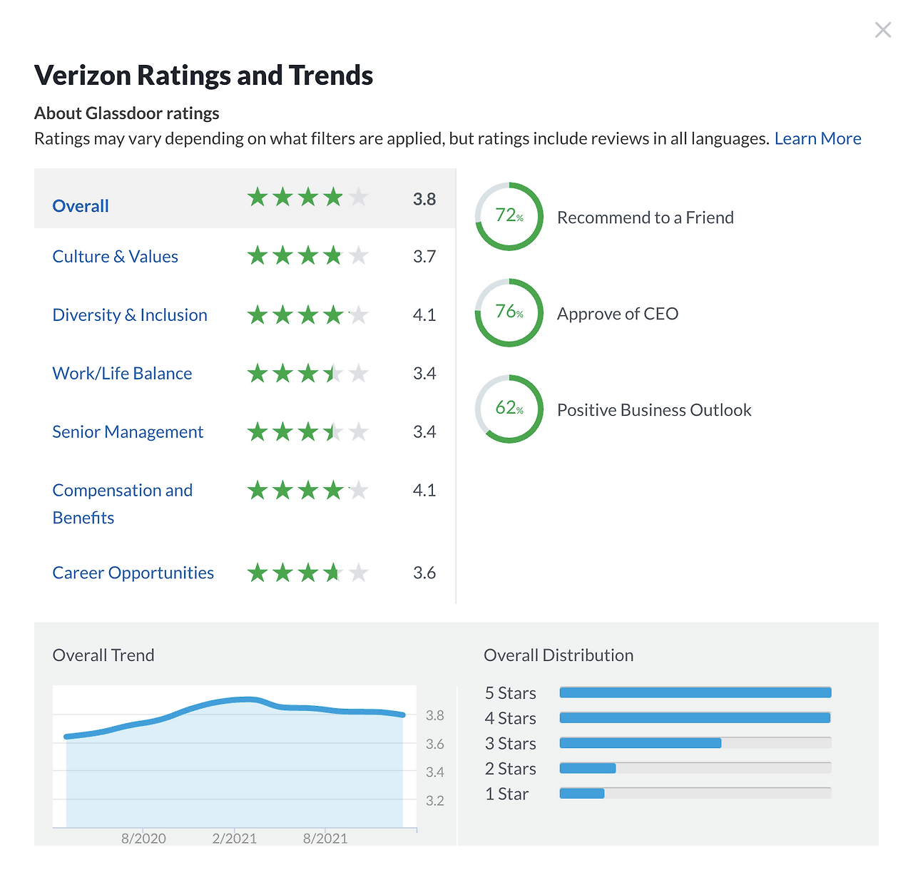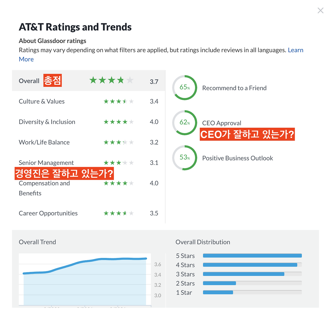 위에서 볼 수 있듯이 AT&T 경영진에 대한 내부직원들의 평가가 경쟁사 버라이즌과 비교해서 좋지 못합니다.(62% vs 76%) 두 기업 재무제표 상태가 비슷한 상태에서 어떠한 기업에 투자할 지 고민이 될 때 이와 같은 정성적 분석을 통해 좀 더 나은 기업을 추려낼 수 있습니다.