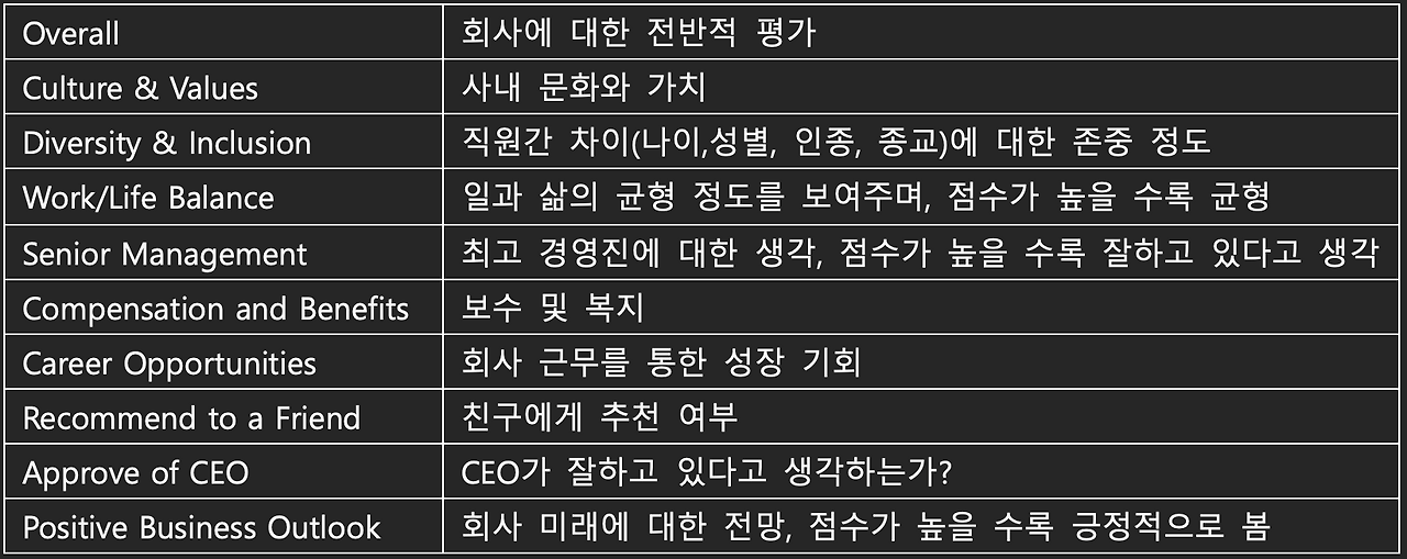 Glassdoor 에서 제공하는 주요 정성 지표들은 다음과 같습니다.