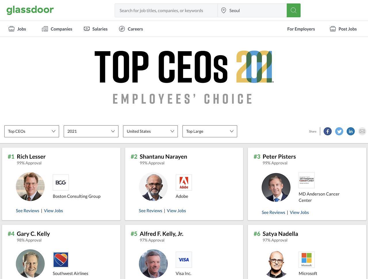 Glassdoor 에서는 해당 지표들을 통해 매년 최고의 CEO를 선정합니다. 선정된 CEO와 회사 실적 및 주가를 확인해 보면, 큰 상관관계가 있음을 발견할 수 있습니다. 마이크로소프트, 비자, Adobe, Southwest Airline 등 의 CEO가 좋은 점수를 받고 있었습니다.