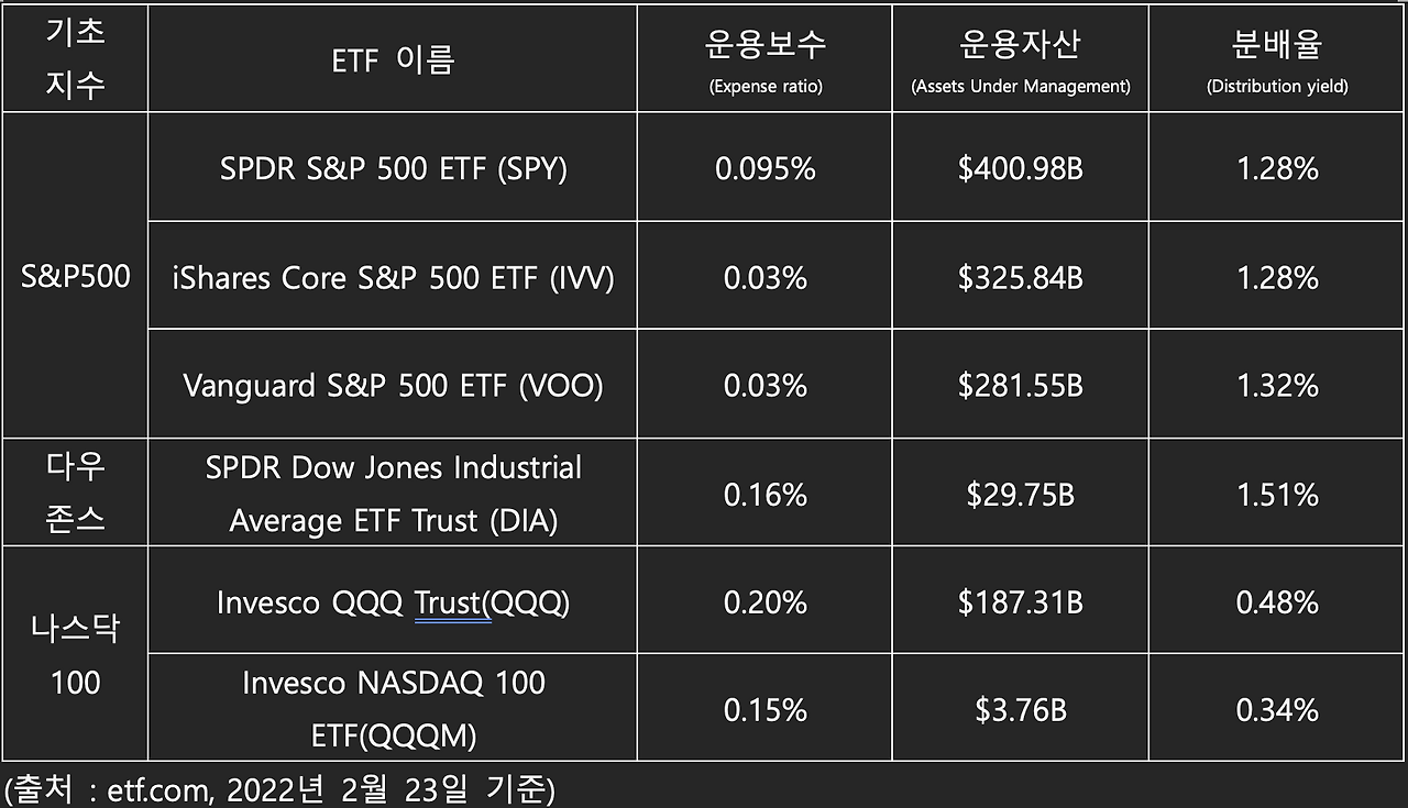 S&P500 지수를 추종하는 ETF는 자산운용사에 따라 여러 종류가 있습니다. 그 중에서도 State Street Global Advisors에서 만든 SPY(티커명)가 가장 유명하고 운용자산규모(Assets Under Management)도 가장 큽니다.