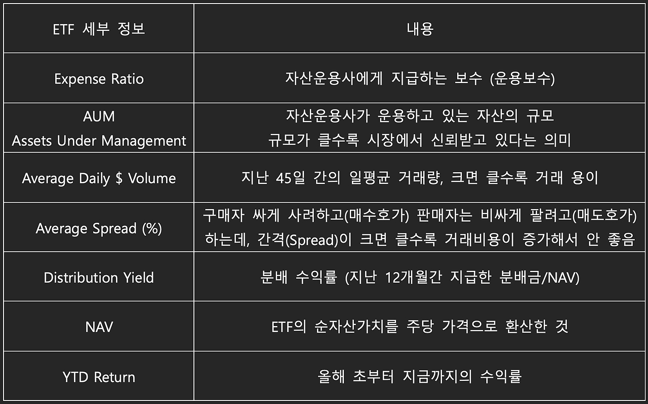 미국 사이트에서 ETF관련 정보를 검색하다 보면 자주 만나게 되는 용어들은 다음과 같습니다.