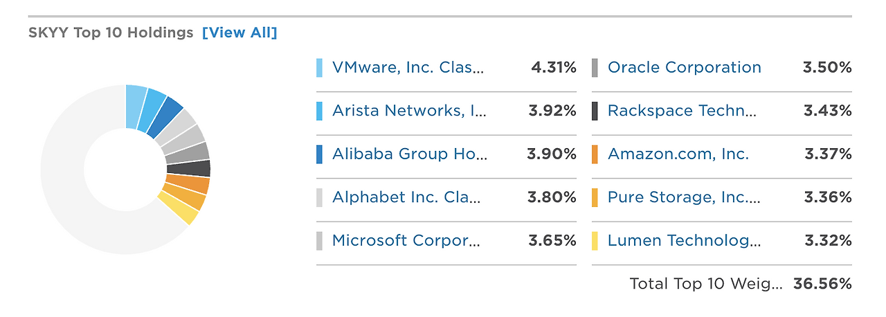 예컨대, 2단계에서 살펴본 SKYY ETF(클라우드 ETF)의 PDF(어떤 회사를 ETF에 담았는지 나옴)를 확인해 봅니다. 아래는 SKYY가 투자하는 주요 10개 기업을 보여줍니다.