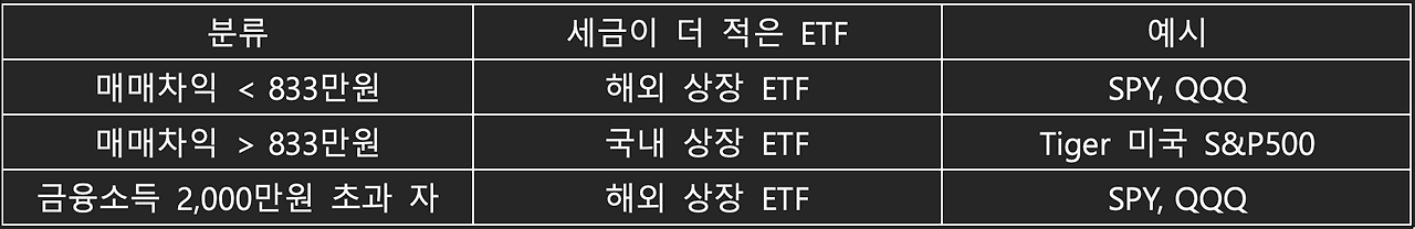 따라서, 매매차익이 833만원 이하일 경우에는 해외에 상장된 ETF가 좋고, 833만원 이상일 경우에는 국내에 상장된 ETF가 좋습니다. 단, 해외에 상장된 ETF의 경우 매매차익이 금융종합소득 2,000만원에 포함되지 않기 때문에 본인의 연간 금융소득이 2,000만원을 넘어가거나 고소득 직장인인 경우에는 해외에 상장된 ETF가 좋습니다.