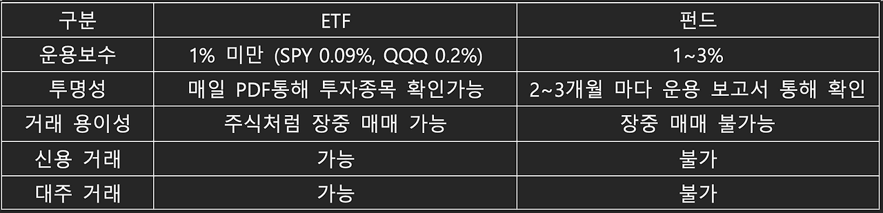 이러한 펀드의 불편함을 해소하기 위해 개발된 것이 ETF입니다. ETF는 환매수수료가 없고 주식처럼 실시간 거래가 가능합니다. 운용 수수료도 펀드 대비 저렴합니다. 펀드 운용수수료가 1~2%인반면, S&P500지수에 투자하는 ETF인 SPY의 운용수수료는 0.09%입니다. 게다가, 주식처럼 신용거래와 대주 거래도 가능합니다.