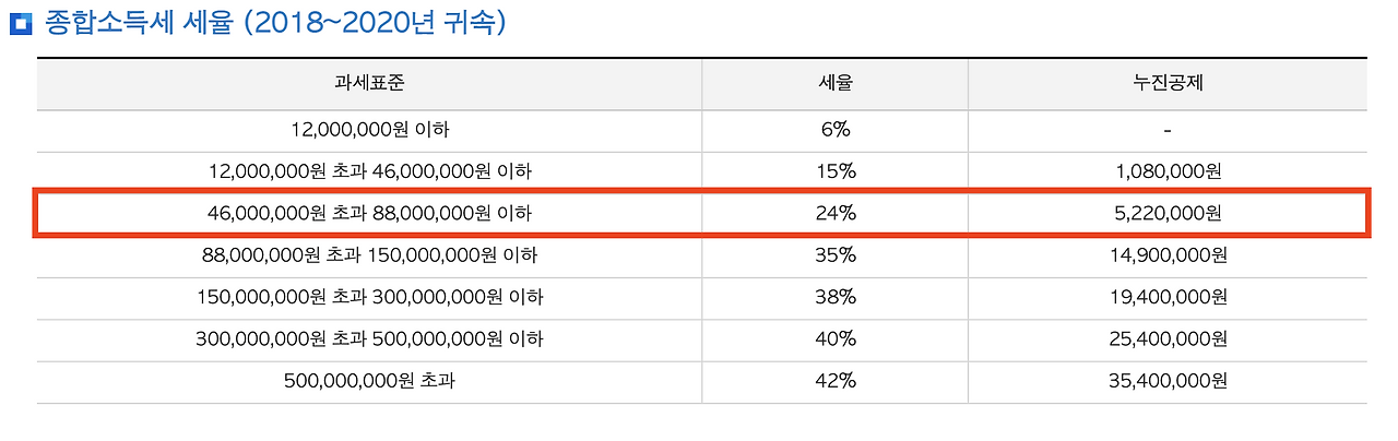 예컨대, 직장인 A 씨의 근로소득으로인한 과세표준이 3천만원인데 한국 증시에 상장된 ETF를 사고 팔아 5천만원이 생겼다면, 최종 과세표준은 6천만원이 됩니다. 직장에서 번 돈 3천만원에서 ETF 매매차익 3,000만원(5천만원에서 2천만원 공제적용)을 더해서 6천만원이 최종 과세표준이됩니다. 6,000만원은 종합소득세 세율 24%를 적용 받습니다.