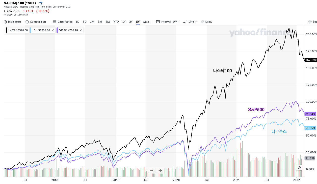 최근 5개년 수익률을 확인해 보면 나스닥100>S&P500>다우지수 순입니다.