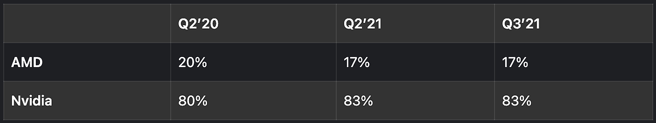 게이밍용 GPU 게이밍용 GPU 시장은 엔비디아와 AMD가 양분하고 있습니다. 독과점 형태의 시장인 만큼 제조사의 가격 결정권이 큽니다. 작년에 공급대란으로 GPU 가격이 미친 듯이 올랐지만, 대안이 없기 때문에 소비자들은 울며 겨자 먹기 식으로 구매할 수밖에 없었습니다. 즉, 인플레이션 시기에 가격을 소비자에게 전가할 수 있습니다. 작년 3분기 말 기준으로 엔비디아는 시장 점유율 83%를 차지하고 있으며, 매년 시장 점유율이 조금씩 증가하고 있는 상황입니다.