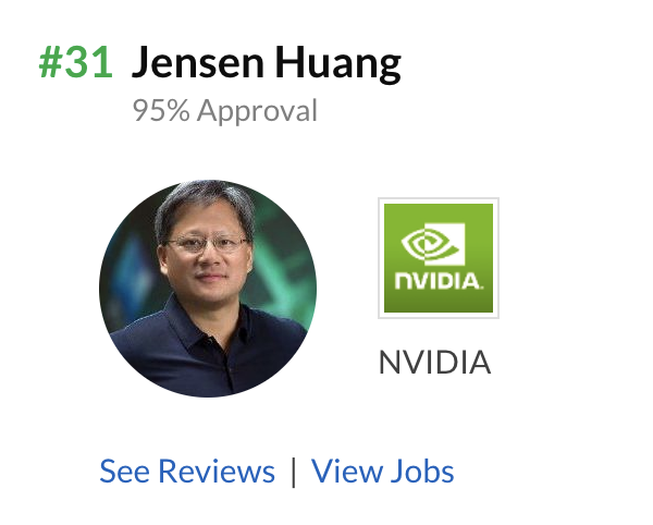 회사 리뷰 업체인 글래스도어(glassdoor.com)에 따르면 엔비디아 직원의 95%가 젠슨 황(CEO)이 회사를 잘 경영하고 있다고 밝혔습니다. 미국에 상장된 6천여 개의 기업 가운데 최고의 CEO 31위에 뽑혔습니다. 100위 안에 포함된 기업의 CEO들은 적어도 90% 이상의 지지를 직원들로부터 받고 있습니다.