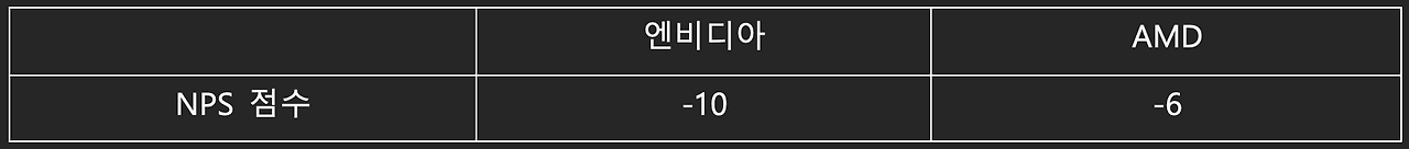 엔비디아와 AMD 모두 디트랙터가 조금 더 많은 모습을 보여주고 있습니다. 추정컨데, 엔비디아는 신제품 출시 후 얼마 되지 않아 비슷한 가격에 훨씬 좋은 성능의 제품을 내놓기 때문에 미리 구매한 소비자들의 불만이 증가해 NPS 점수가 낮아진 것으로 보입니다. 하지만, 엔비디아와 AMD 말고 대안이 없기 때문에 소비자들은 계속해서 구매할 수밖에 없습니다. 우리나라에서는 젠슨 황 CEO를 황통수(젠슨 황 + 소비자 뒷통수 잘침)라고도 부릅니다.