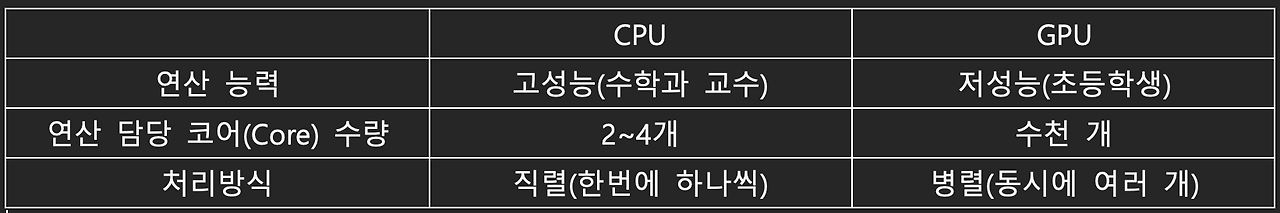 CPU와 GPU의 차이를 쉽게 설명하자면 CPU는 2~4명의 똑똑한 수학과 교수이고 GPU는 초등학생 수 천명이 있는 것으로 비유할 수 있습니다. 굉장히 어려운 수학 문제 1개는 똑똑한 수학과 교수 혼자서도(직렬) 잘 풀겠지만, 곱하기처럼 간단한 산수 문제 1,000개는 초등학생 1,000명이 동시에(병렬) 푸는 것이 더 낫습니다.