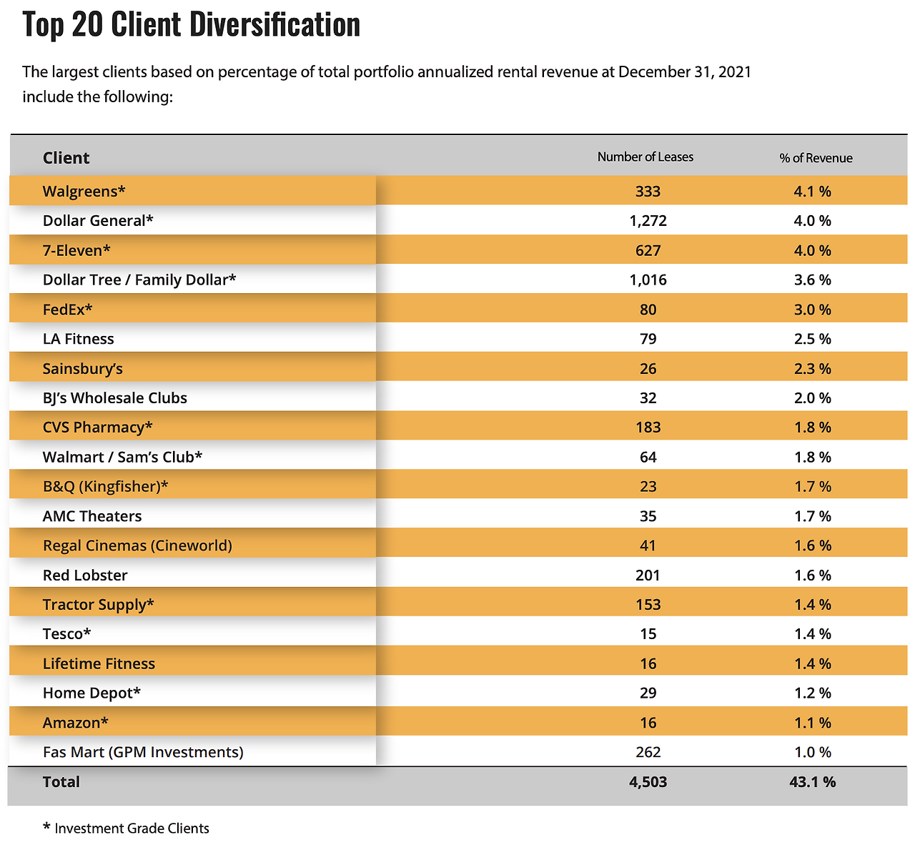 아래는 리얼티 인컴의 상위 20개 임차 기업 명단입니다. 대부분의 기업들이 재정적으로 안정된(Investment Grade Clients) 생필품 유통 기업들(Essential 사업자)입니다. 1위부터 4위 업체들은 Walgreens(드럭 스토어), Dollar General(미국판 다이소), 7-Eleven(편의점), Dollar Tree(미국판 다이소)입니다.