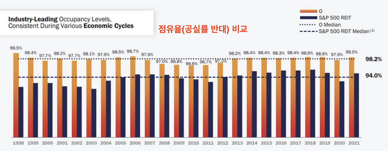 아래의 표는 리얼티 인컴이 보유한 부동산의 점유율을 보여줍니다. 미국에서는 공실률이라는 말 대신에 점유율(Occupancy Levels)이란 단어를 주로 씁니다. 점유율은 공실률의 반대말로 수치가 높을수록 좋습니다. 리얼티 인컴은 1998년부터 2021년까지 98.2%의 점유율 (1.8% 공실률)을 보여주고 있습니다. S&P500에 있는 다른 리츠 회사들의 점유율 (94.0%) 보다 리얼티 인컴의 점유율이 더 높습니다 (4.2% 차이).