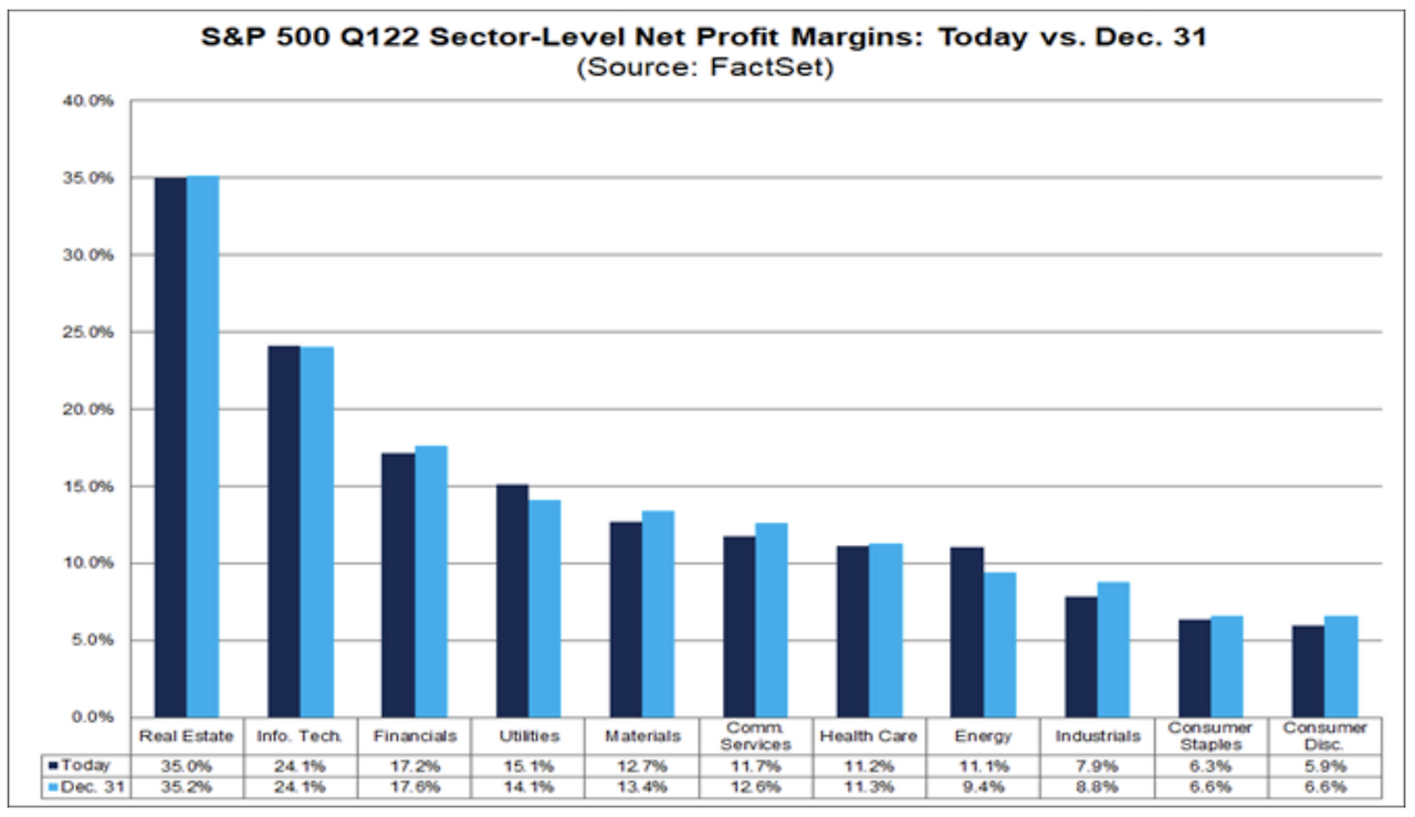 2022년 1분기 기준 주요 섹터별 Profit Margin은 다음과 같습니다. 부동산과 기술 섹터의 마진율이 다른 섹터보다 상당히 좋아 보입니다.