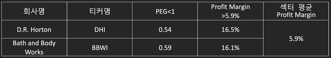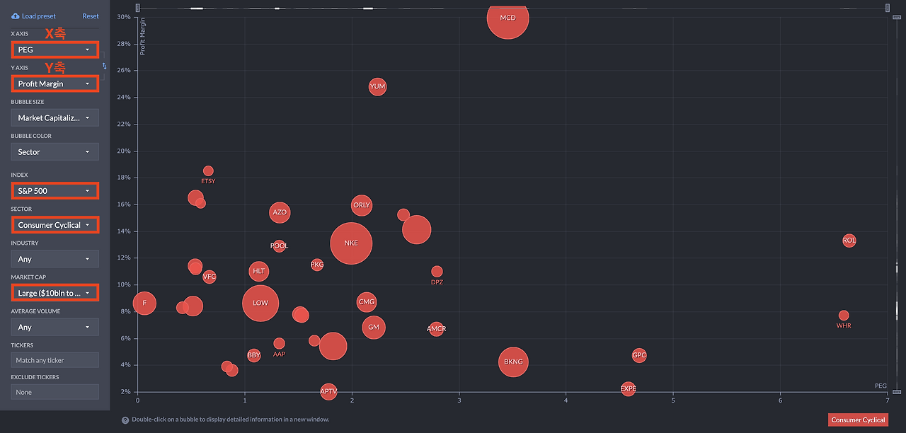 위 링크에 들어가면, 좌측편에 조건을 걸어, 조건에 만족한 기업들만 볼 수 있습니다. 필자는 5개의 조건을 걸어보았습니다. X축에 PEG, Y축에 Profit Margin, 인덱스에는S&P500, 섹터는 Consumer Cyclical(경기순환주), 마켓캡(시총)에는 Large Cap (시총 100억달러 이상 2000억달러 미만)을 걸었습니다. 위로 갈수록 Profit Margin이 좋고, 왼쪽으로 갈수록 PEG값이 작아서 저평가 되어있다는 뜻입니다. 이를 통해 찾은 저평가 경기 순환주(Consumer Cyclical)는 다음과 같습니다.