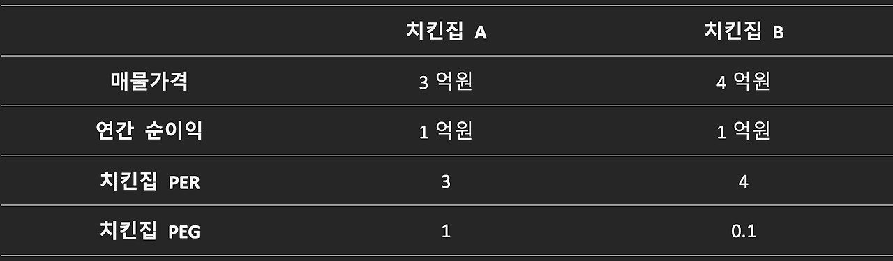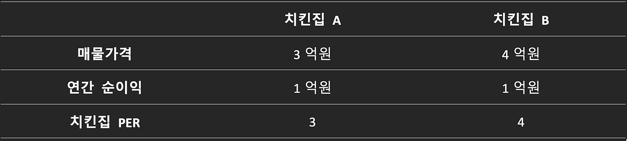 저평가된 주식을 찾기 위해 사람들은 PER를 많이 사용합니다. 하지만, PER는 미래 성장성이 반영되어 있지 않다는 단점이 있습니다. 예를 들어 설명해 보겠습니다. 회사 사표 내고 한 때 치킨집을 알아보고 있었습니다. 그리고, 적당한 매물 2개를 찾았습니다.