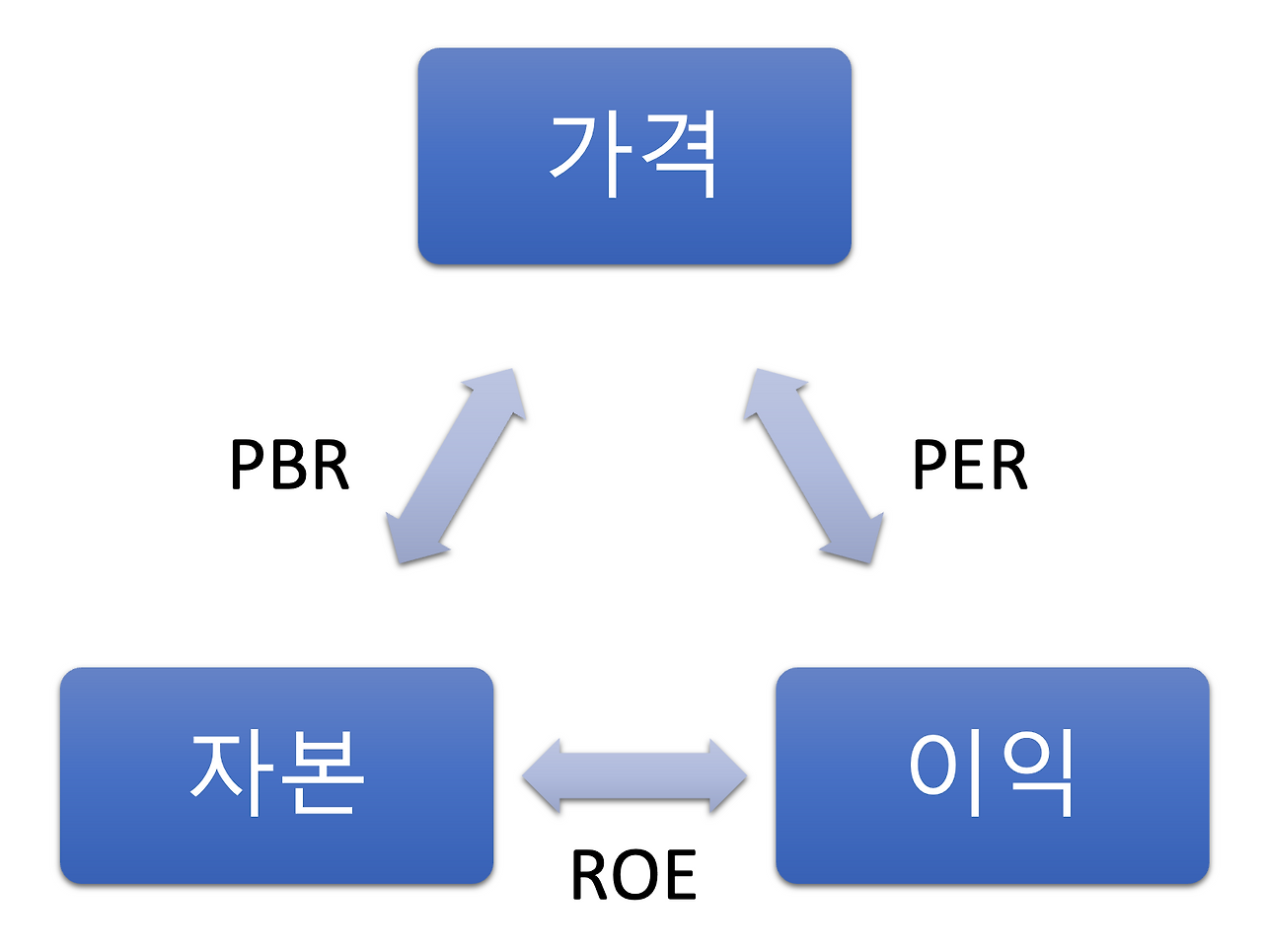 맨 위에 가격이 있고 밑에 자본과 이익이 있습니다. 이렇게 세 가지 용어(가격, 자본, 이익)를 활용하면 기업가치 평가에 가장 기본적인 지표 세 가지를 먼저 도출할 수 있습니다.