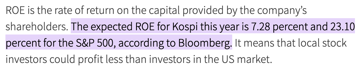 코리아 헤럴드의 기사를 보면 코스피 평균 ROE는 7.28% 인 반면, S&P500 평균 ROE는 23.1%입니다. 여기 미국 주식을 해야 하는 또다른 이유를 찾았습니다. 코스피는 10억을 투자해서 7280만 원을 벌고, S&P500은 2억 3100만 원을 법니다. 미국 주식이 한국보다 약 3~4배 정도 되는 수익을 얻고 있다는 뜻입니다.
