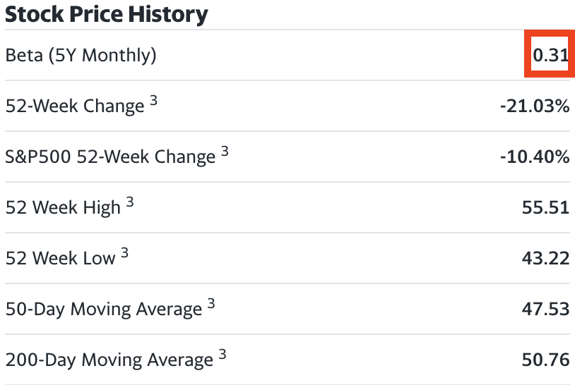 테슬라 베타값 1.98의 의미는 주가 지수가 10 % 상승했을 때 테슬라 주가는 19.8% (주가지수 10% X 베타값 1.98) 상승한다는 뜻입니다. 같은 방식으로 버라이존 베타값 0.42의 의미는 주가지수가 10% 상승할 때 버라이존 주가는 4.2% (주가지수 10% X 베타값 0.42) 상승한다는 뜻입니다.