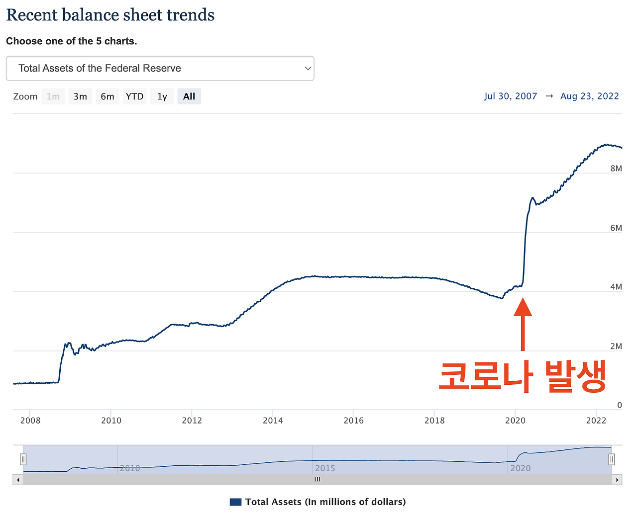자사주 매입은 명품 회사들이 팔고 남은 재고를 소각해서 희소성을 유지하는 방식으로 비싼 가격을 유지하는 것과 유사합니다. 연준이 지금까지 사들인 채권의 양, 즉 시중에 뿌린 돈은 2022년 8월 23일 기준으로 8.8조 달러이고, 구글에서 "Fed Balance Sheet"를 검색하거나 다음 링크에서 확인해 볼 수 있습니다.