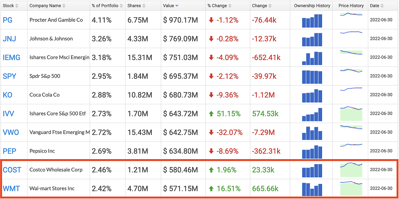 다음은 미국의 유명 투자자 중 하나인 레이 달리오가 운영하는 Bridgewater의 2분기 포트폴리오입니다. 상위 10개 종목 모두 베타값이 0에 가까운 둔감 기업들입니다. 즉, 하락장에서도 주가가 많이 떨어지지 않는다는 뜻입니다. 특히, 레이 달리오가 2분기에 늘린 코스트코(COST)는 베타값이 0.68이고 월마트(WMT)의 베타값은 0.54입니다. 코스트코와 월마트는 대표적인 경기 방어주입니다. 5월에 인플레이션 우려로 유통주의 주가가 급락했을 때 저가 매수한 것으로 보입니다.