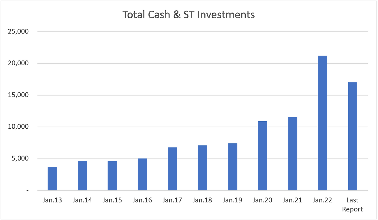 엔비디아가 보유 중인 총 현금(Total Cash)은 2013년 1월 37억 달러에서 2022년 7월 기준 170억 달러까지 4.6배 성장했습니다.
