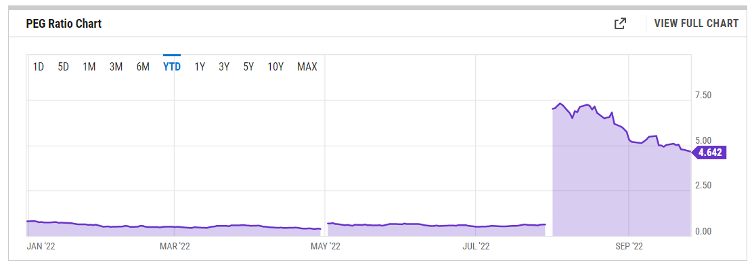 아래 그림은 올해 PEG의 변동추이를 보여줍니다. 줄곧 1 밑을 유지하다가, 최근 저조한 실적과 함께 PEG이 치솟았습니다.