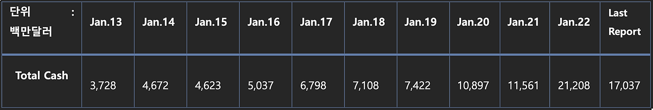 남자들이 캐피털로 뽑은 외제차로 자신의 자산을 부풀려 보이듯, 회사도 외상을 늘려 매출을 종종 속입니다. 하지만, 회사가 절대 속일 수 없는 지표가 있으니, 그것은 바로 보유하고 있는 현금입니다. 다음은 엔비디아가 지난 10년간 보유하고 있는 현금량을 보여줍니다.