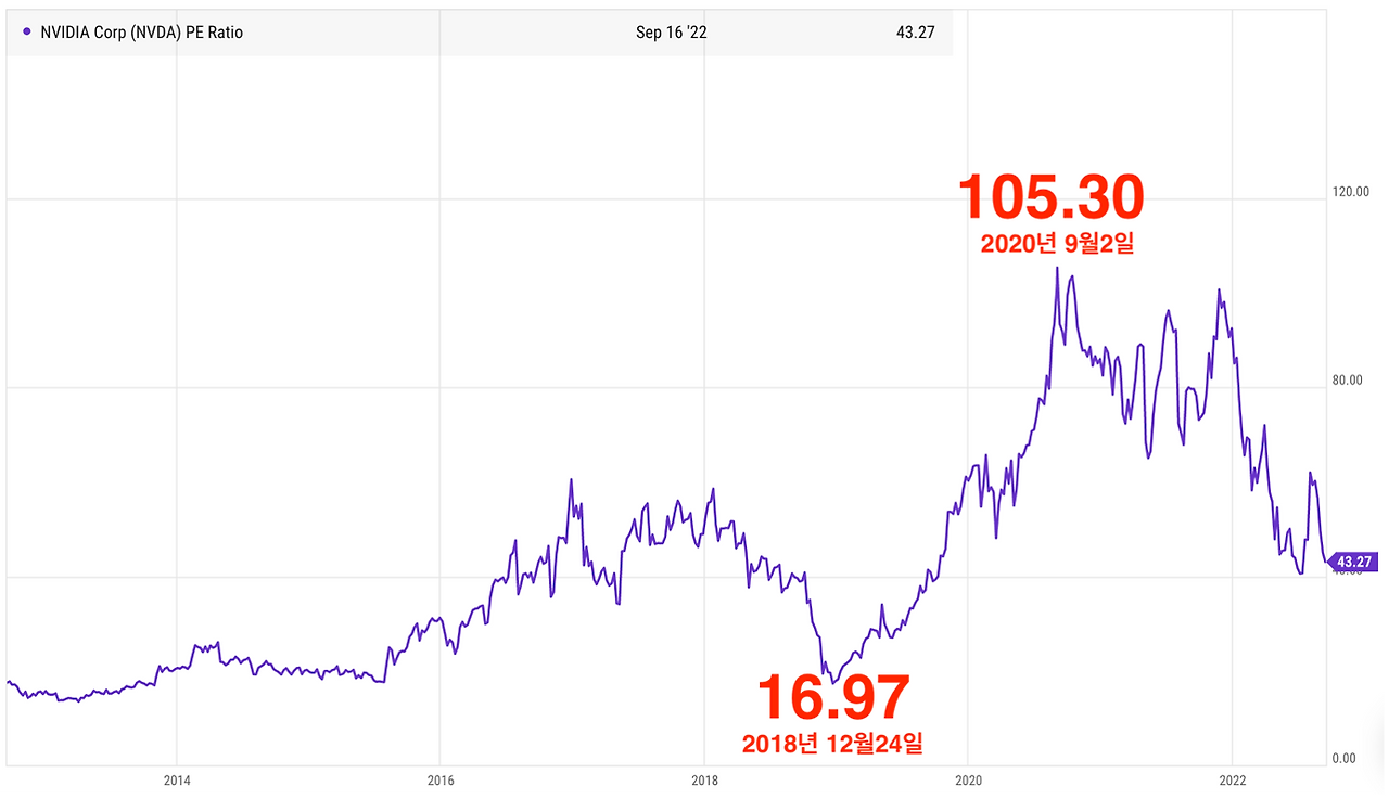 엔비디아 PER가 낮을 때는 2013년 2월에 13까지 내려갔고, 높을 때는 105.30까지 올랐습니다. 지난 5년 간 엔비디아의 평균 PER는 57.66이고, 글을 쓰는 현재 9/26일 기준 PER는 40.10입니다. 긍정론자들은 평균 PER보다 낮으니 지금 매입하는 것이 옳다고 주장하고, 부정론자들은 섹터 중간 PER가 20.91 이기 때문에 앞으로 주가가 앞으로 더 떨어질 것이라고 주장합니다.