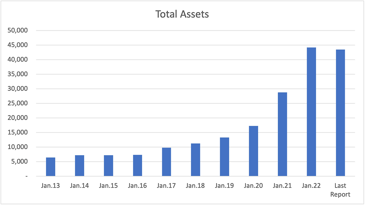 같은 방식으로 회사가 얼마나 성장했는지 보려면, 총자산(Total Assets)을 확인하면 됩니다. 총자산(Total Assets)은 회사가 돈을 벌기 위해 현재 가지고 있는 공장, 땅, 건물, 컴퓨터, 현금, 단기 투자상품 등을 말합니다. 회사는 총자산을 활용해서 돈을 법니다.