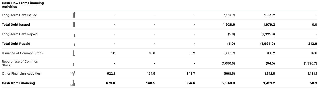 에어비앤비는 2020년부터 자사주 매입을 실시하고 있습니다. Repurchase of Common Stock이 자사주 매입이고 회사 입장에서 돈을 썼기 때문에 마이너스(괄호)로 표시됩니다.