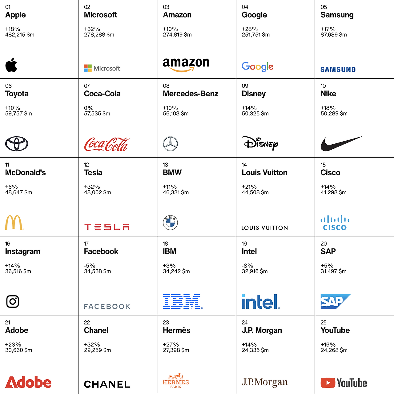 브랜드 가치 급상승(전년대비 30% 이상) : 2위 Microsoft (32%), 12위 Tesla (32%), 22위 Channel (32%), 63위 Lego (30%), 75위 Ferrari (31%)