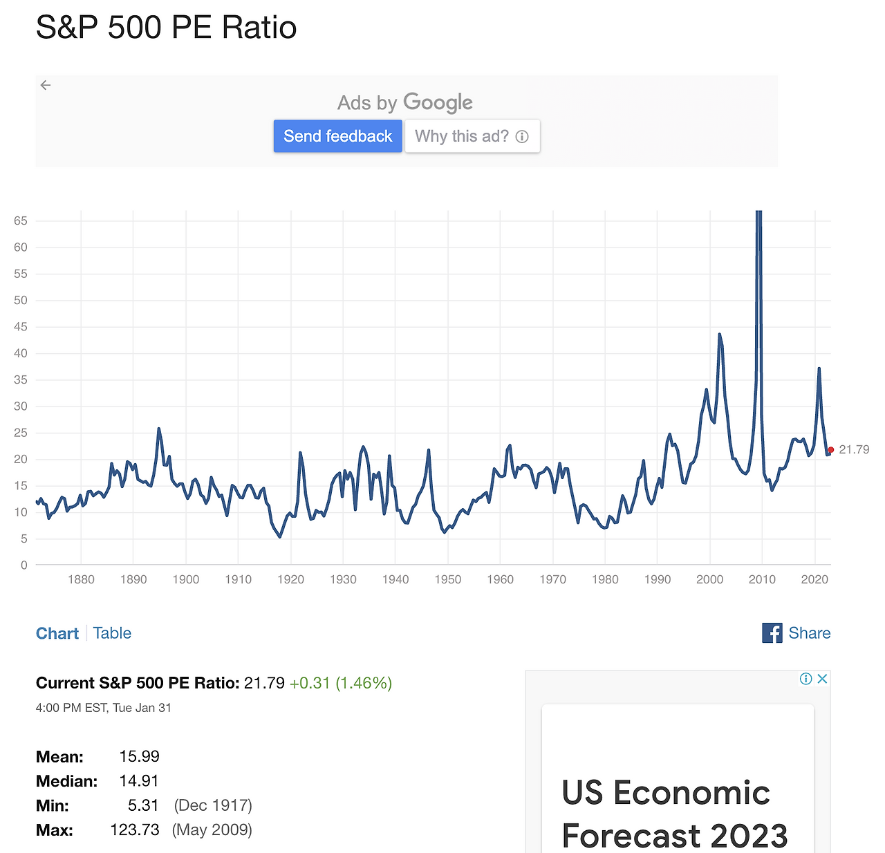 1/31일 기준 S&P500의 P/E는 21.79입니다.