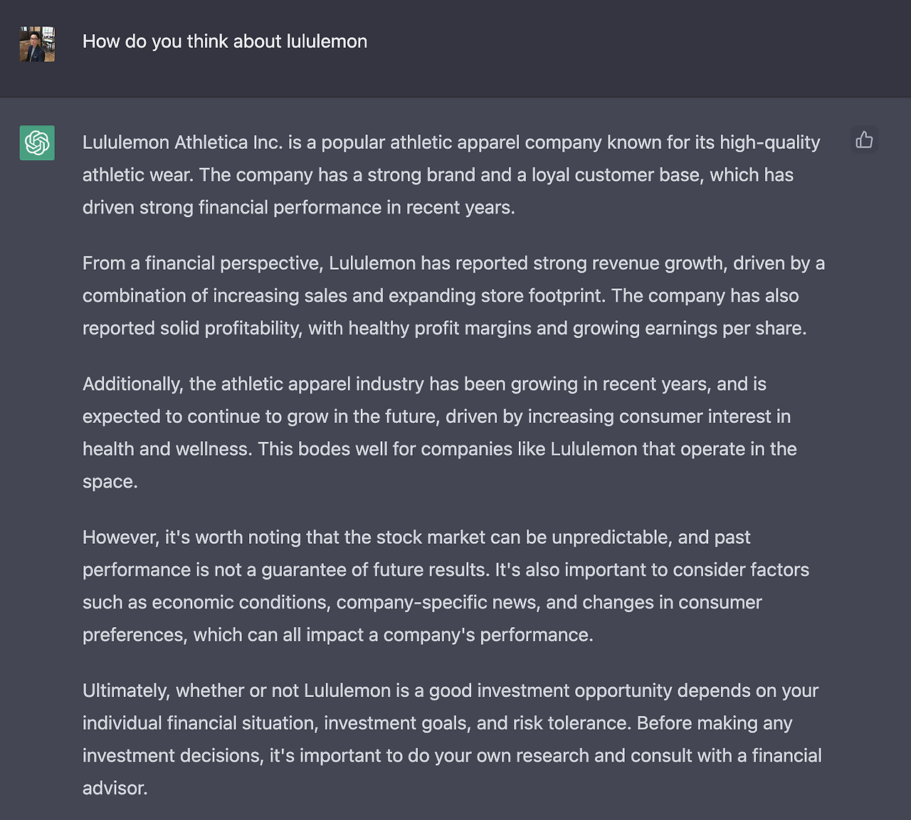 챗 GPT는 인터넷상에 있는 방대한 양의 정보를 학습한 후 인간의 뇌처럼 "뉴럴 네트워크(Neural Network)"를 형성하고 질문과 가장 연관도가 높은 답변을 제시합니다. 따라서, 챗 GPT가 제시하는 답변은 룰루레몬에 대한 대중 및 전문가들의 생각을 대변할 수 있을 것이란 생각이 들었습니다.