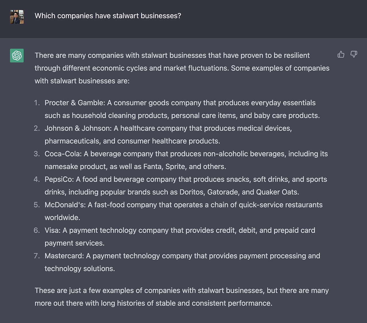 챗 GPT를 활용해서 절대 잃지 않는 회사를 찾아보겠습니다. 절대 잃지 않는 투자대상은 영어로 Stalwart한 회사를 말합니다. Stalwart를 한국어로 번역하면 "튼튼한, 용감한, 충실한"이란 뜻이지만, 투자세계에서 말하는 Stalwart는 어떠한 경제 상황에서도 회사가 충실하게 꾸준히 이익을 낸다는 뜻입니다.