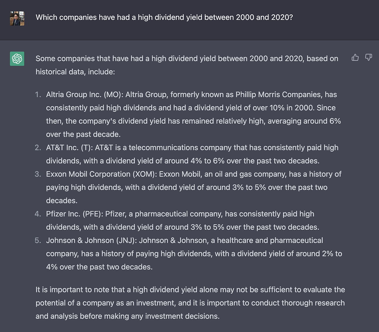 "과거 데이터를 기반으로 2000 년에서 2020년 사이에 높은 배당 수익률을 기록한 일부 회사는 다음과 같습니다.