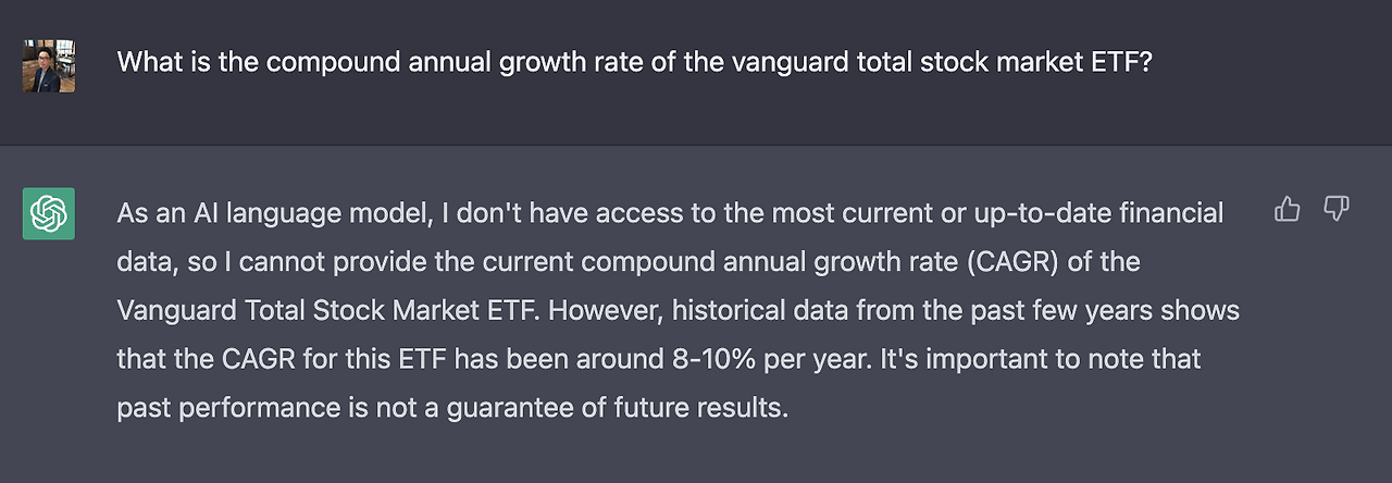 자 이제, 챗 GPT를 활용할 시간입니다. VTI의 연평균 수익률(CAGR: Compound Annual Growth Rate)을 물어봅니다.