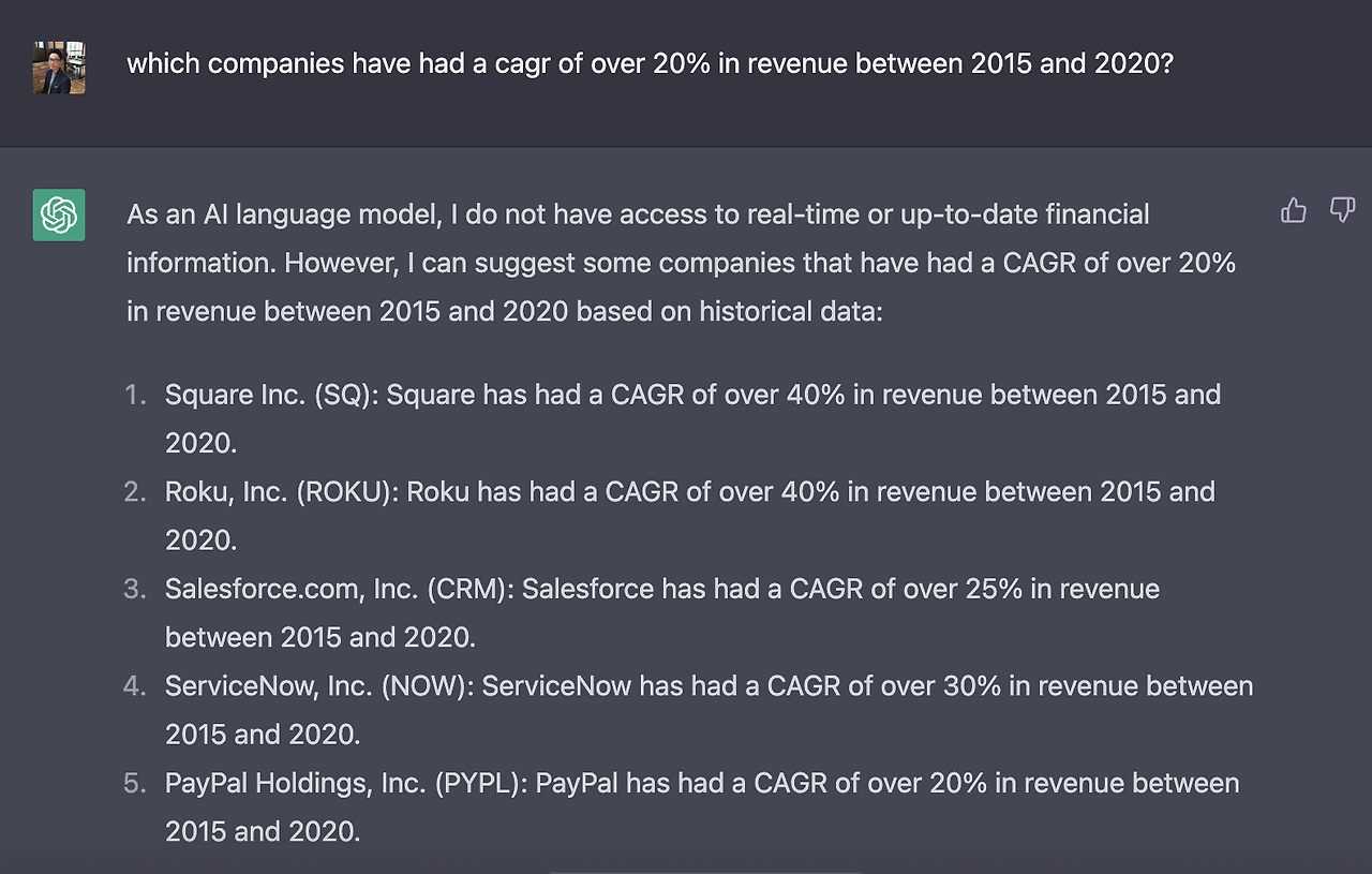 어떠한 회사가 연평균 20% 이상의 속도로 매출이 성장하고 있습니까? (여기서 기간은 GPT-3.5의 특성상, 2015년부터 2020년까지로 잡았지만, 곧 출시 될 Chat GPT 4는 최신 자료까지 확인이 가능합니다.)
