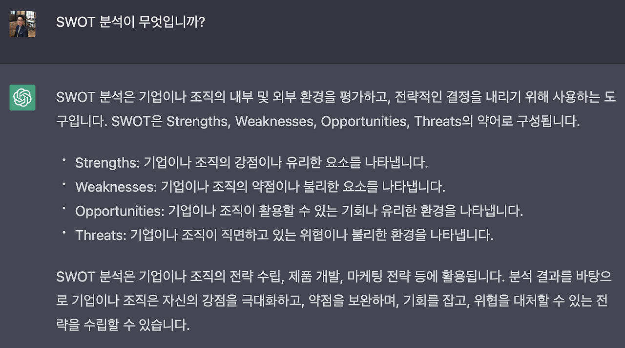 잡담은 여기까지만 하고 챗 GPT에게 SWOT이 뭔지 물어보았습니다.